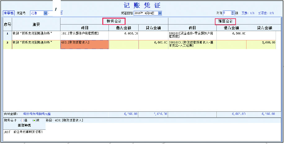 根據(jù)科目及業(yè)務(wù)事項(xiàng)匹配規(guī)則,錄入財(cái)務(wù)會(huì)計(jì)憑證自動(dòng)帶入預(yù)算會(huì)計(jì)憑證。